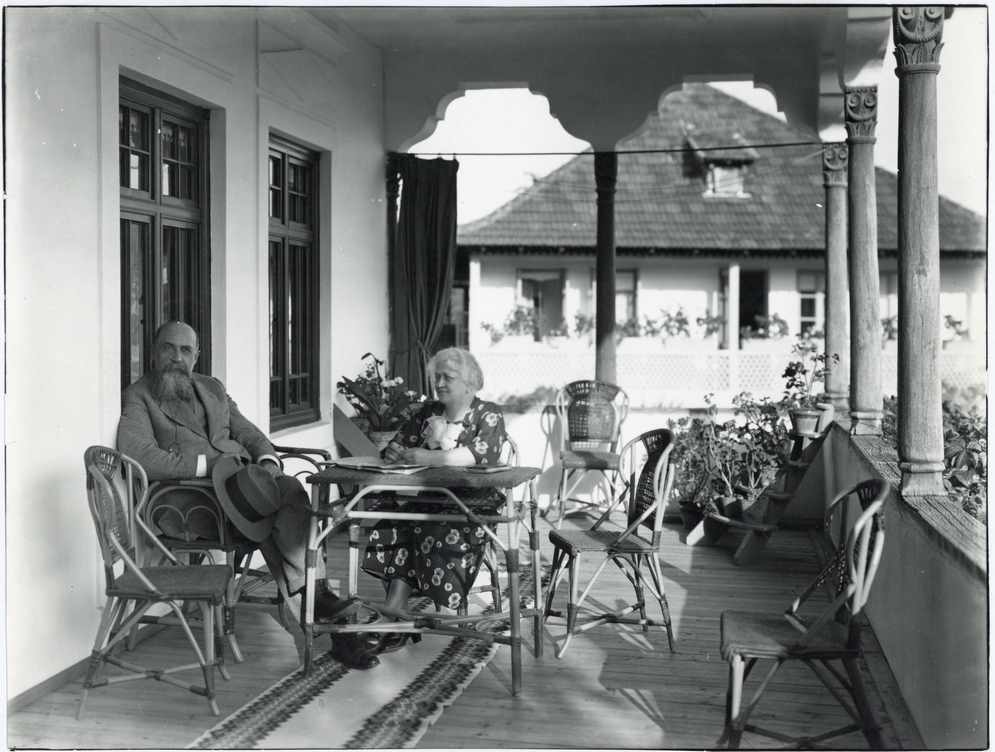 Nicolae și Ecaterina Iorga pe terasa casei sale de la Vălenii de Munte, anii 30