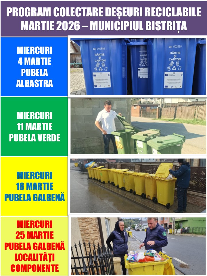 - Programul de colectare a deșeurilor reciclabile, în luna martie, în municipiul Bistrița și localitățile componente