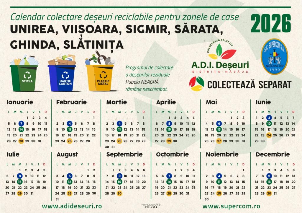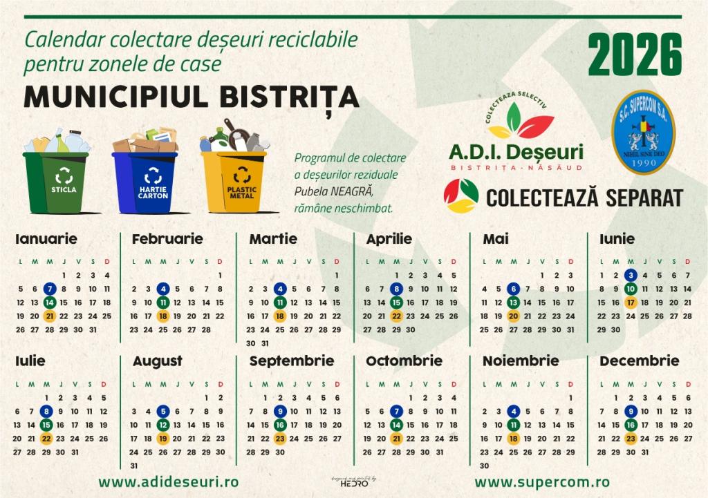 În luna APRILIE 2026, programul de colectare a deșeurilor reciclabile în Municipiul Bistrița și în localitățile componente – Unirea, Viișoara, Sărata, Sigmir, Ghinda și Slătinița, începe de săptămâna viitoare – de miercuri, 8 aprilie! Implică-te în colectarea selectivă a deșeurilor reciclabile încă din gospodăria ta!