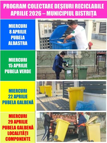 În luna APRILIE 2026 are următorul program de colectare a deșeurilor reciclabile pentru Municipiul Bistrița și localitățile componente: