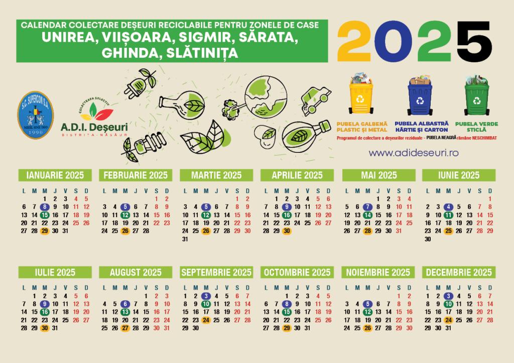 Începând din acest an, ziua de colectare a pubelei galbene pentru TOATE LOCALITĂȚILE COMPONENTE – Unirea, Viișoara, Sigmir, Sărata, Slătinița și Ghinda va fi ultima zi de miercuri din lună!