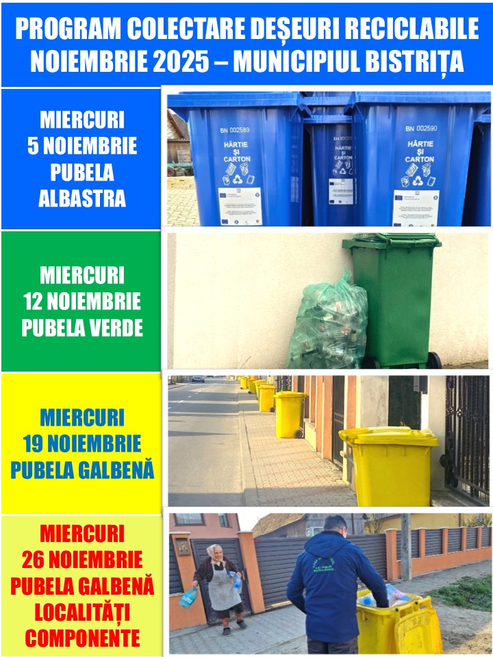 În NOIEMBRIE 2025, programul de colectare a deșeurilor reciclabile pentru Municipiul Bistrița și localitățile componente începe din prima săptămână întreagă a lunii.