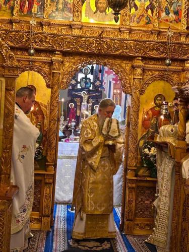 De la ora 10:00, ierarhul a săvârșit Sfânta Liturghie în biserica de piatră a mănăstirii, înconjurat de un sobor de preoți și diaconi. Din sobor au făcut parte protopopul de Năsăud, pr. Ovidiu Sermeșan, duhovnicul mănăstirii, protos. Nicodim Sîngeorzan, directorul Centrului Misionar de Tineret „Ioan Bunea” din Sîngeorz-Băi, pr. Paul Gavriloaie, precum și alți clerici invitați. Răspunsurile liturgice au fost date de corul maicilor așezământului monahal.
