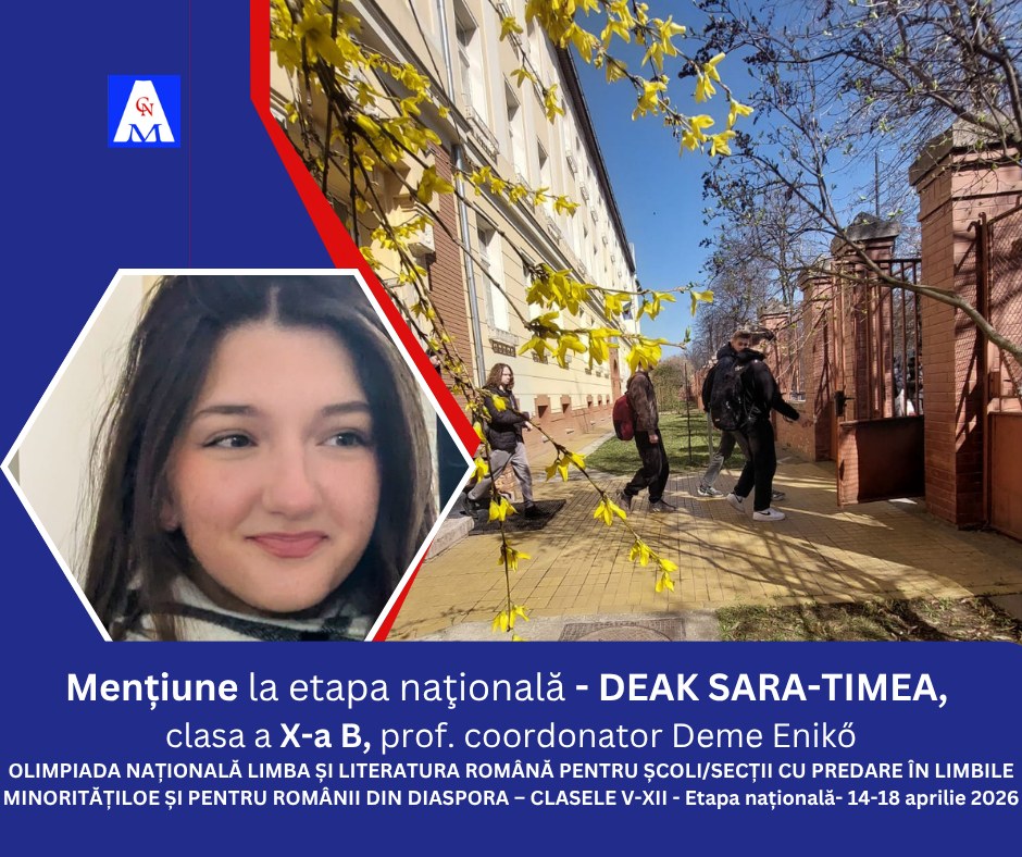 Sara Timea Deak, elevă în clasa a X-a B de la Colegiul Național "Andrei Mureșanu" Bistrița a fost distinsă cu mențiune la etapa națională a Olimpiadei de Limba și Literatura Română pentru școli/secții cu predare în limbile minorităților și pentru românii din diaspora − secțiunea B. Eleva a fost pregătită de către doamna profesor Eniko Deme. " "Felicitări, Sara! Felicitări, doamna profesoară!", este mesajul transmis de către CNAM, pe pagina de facebook a unității de învățământ.