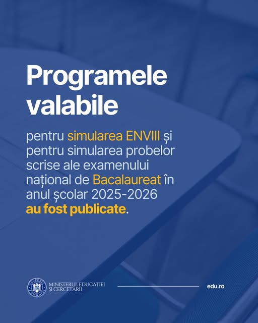 Ministerul Educației și Cercetării asigură cadrul de implementare pentru organizarea simulării Evaluării Naționale pentru absolvenții clasei a VIII-a (ENVIII) și a simulării probelor scrise ale examenului național de bacalaureat în anul școlar 2025 - 2026.