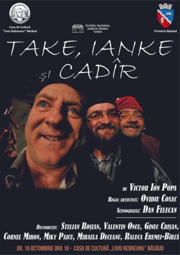 Vă invităm din nou la o piesă de teatru deosebită, alături de prietenii noștri de la Teatrul Național ‘‘Aureliu Manea’’ din Turda! De această dată, cunoscuta piesă ‘‘Take, Ianke și Cadîr’’, în regia lui Ovidiu Cosac - „O comedie devenită clasică, aparţinând literaturii interbelice şi aducând în scenă o temă de mare actualitate: relaţiile inter-etnice dintre un român, un evreu şi un turc. O piesă despre toleranţă, prietenie şi dragoste.