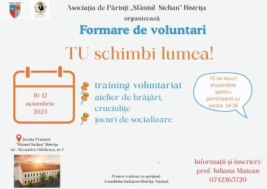 Asociația de Părinți „Sfântul Stelian”, în parteneriat cu Colegiul Tehnic INFOEL Bistrița, anunță lansarea proiectului „TU SCHIMBI LUMEA!”, un program dedicat tinerilor cu vârste între 14 și 18 ani, care își doresc să devină voluntari activi și să contribuie la schimbarea pozitivă a comunității. Proiectul beneficiază de finanțare nerambursabilă din partea Consiliului Județean Bistrița-Năsăud și se va desfășura în perioada 10 – 12 octombrie 2025, la Școala Primară „Sfântul Stelian” din Bistrița, care este și parteneră în cadrul proiectului. Un program care inspiră implicare și responsabilitate Proiectul „TU SCHIMBI LUMEA!” își propune să le ofere tinerilor ocazia de a învăța ce înseamnă voluntariatul autentic și cum pot transforma ideile, energia și entuziasmul lor în acțiuni concrete care aduc binele în jur. Pe parcursul celor trei zile de activități, participanții vor lucra în echipe, vor lua parte la sesiuni de formare, exerciții de dezvoltare personală și momente de reflecție menite să le dezvolte spiritul civic, empatia și capacitatea de a colabora, ateliere de brățări, cruciulițe, social -games. Beneficii pentru participanți: asigurarea meselor pe durata programului; coffee break-uri pentru socializare și schimb de idei; diplomă de participare; premiu special pentru motivație și implicare. Înscrieri deschise pentru tinerii din județ Tinerii interesați se pot înscrie completând formularul online disponibil la adresa: https://docs.google.com/forms/d/e/1FAIpQLSfQahl_9Kefzheqiz_ZAEtDbLYBKqV2NXelSNcjg5isIBplAQ/viewform?usp=header