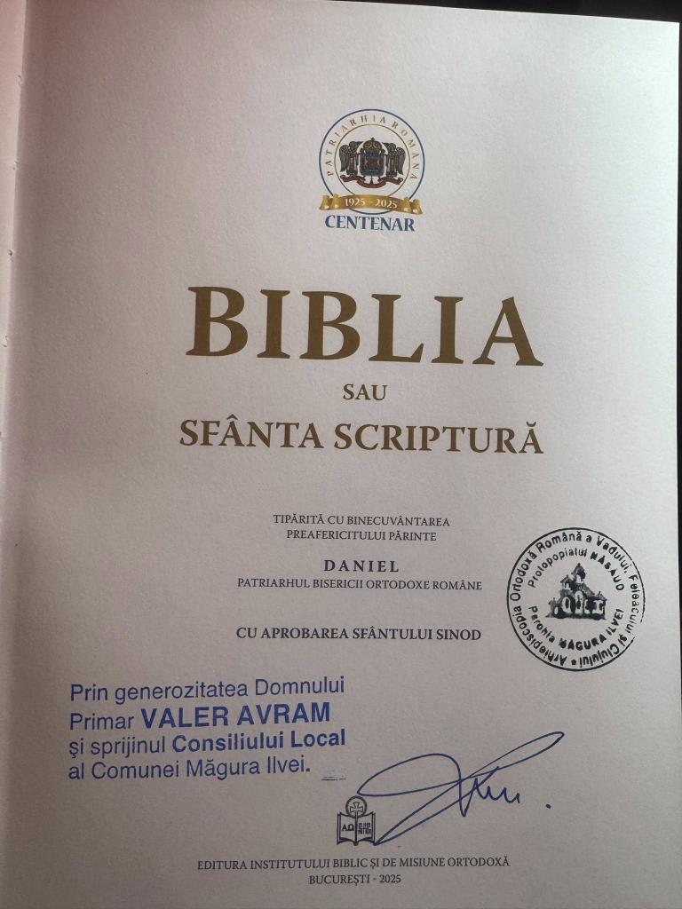 Primăria comunei Măgura Ilvei, sub coordonarea primarului Valer Avram, a realizat un proiect cu profundă încărcătură spirituală și comunitară: o Biblie în fiecare familie. Inițiativa reflectă preocuparea administrației locale pentru valorile creștine, identitatea spirituală și unitatea comunității.