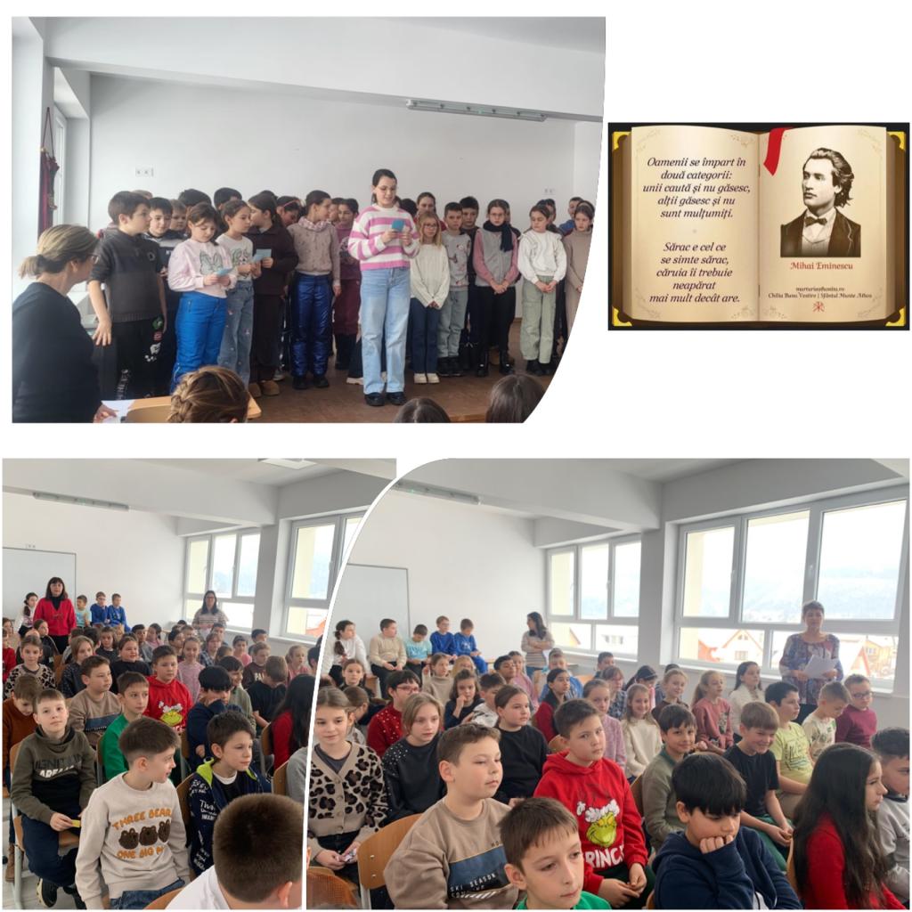 Elevii claselor a III-a și a IV-a au participat la recitări de poezii,cântece, lecturi expresive, discuții despre viața și opera lui Mihai Eminescu.Prin aceste activități, elevii au înțeles importanța operei eminesciene și rolul său în cultura română.