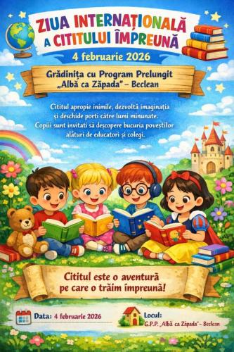 Preșcolarii de la Grădinița ,,Albă ca Zăpada” Beclean , împreună cu educatoarele lor : Mureșan Daniela, Iăunuțiu Narcisa, Roman Lavinia, Șinteregan Laura, Costin Gabriela, Cherhaț Anca, Pop Adina, Vîrtic Ecaterina, Șinar Cristina, Marian Corina, Rusu Dorina, Purcea Miuța, Pop Sanda, Lorincz Lidia, Balint Eliza si Mureșan Ionela, au sărbătorit Ziua Internațională a Cititului Împreună. Invitat special a fost preotul Ioan Aurel Rus, președintele ASTRA Beclean care le-a citit și apoi le-a vorbit copiilor despre importanța cititului.