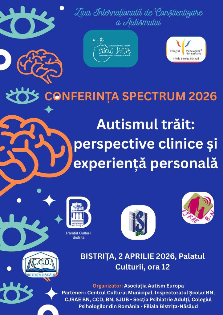 Bistrița, 2 aprilie 2026 — Asociația Autism Europa – Centrul de Resurse și Referință în Autism „Micul Prinț” organizează, cu ocazia Zilei Internaționale de Conștientizare a Autismului, două evenimente care aduc împreună știința, experiența directă și comunitatea: Conferința SPECTRUM 2026 și spectacolul caritabil „Am autism și sunt uimitor”.