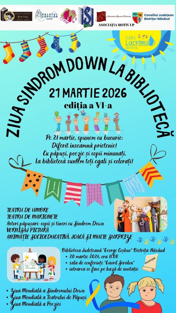 Consiliul Județean Bistrița-Năsăud, C.S.E.I. „Lacrima” Bistrița, în parteneriat cu Biblioteca Județeană „George Coșbuc” Bistrița-Năsăud, Inspectoratul Școlar Județean Bistrița-Năsăud, Centrul Județean de Resurse și Asistență Educațională Bistrița-Năsăud, Asociația Impact Bistrița și Asociația Motiv Up organizează vineri, 20 martie 2026, ora 11:00, în Sala de Conferințe „Gavril Scridon” a Bibliotecii Județene (Bistrița, Strada Alexandru Odobescu, numărul 11) Evenimentul – „ZIUA SINDROM DOWN LA BIBLIOTECĂ” (Ediția a VI-a):